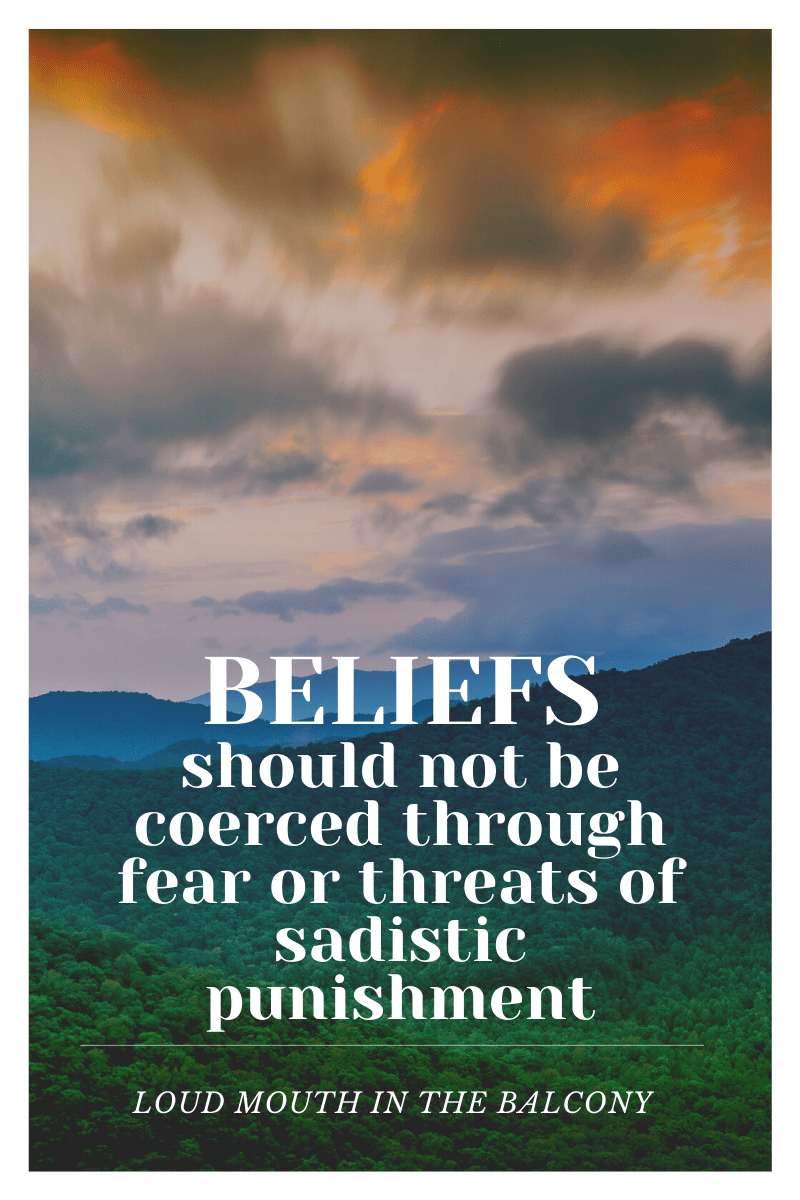 Most of us are not comfortable questioning our beliefs. Some of us are even afraid to consider it. That is understandable. After all, we have been threatened that God will punish us with sadistic, unending pain unless we believe what others instructed us to believe.
